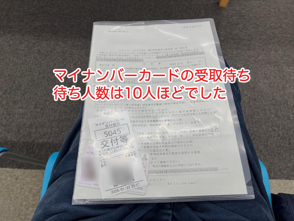早速、2026年1月22日に電車で役所まで行き、予約なしで20分ほど待つだけでマイナンバーカードを受け取ることができました。